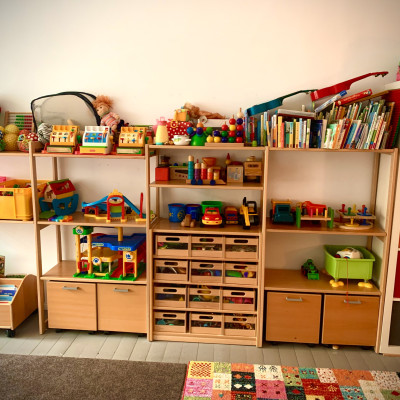 (vorwiegend aus Holz), Regalen und Kindertischen mit 10 Stühlen ausgestattet. Für den Mittagsschlaf hat jedes Kind sein eigenes,